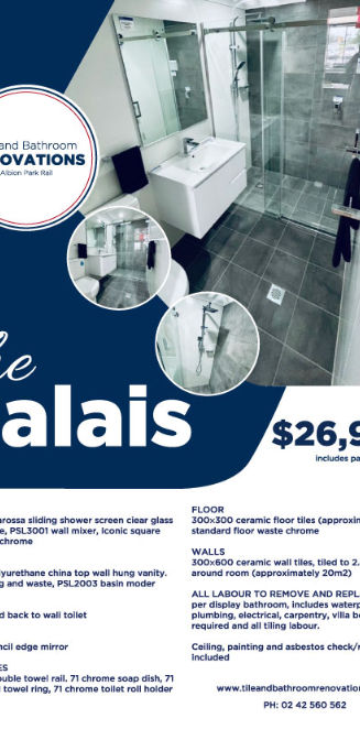 as per display bathroom, includes waterproofing, carpentry, villa board where required and all tiling labour.